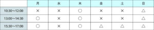 ※△=要相談:調整可能ですのでお気軽にお問い合わせください。